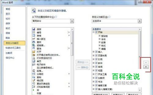 单击“自定义功能区…”命令,将弹出一个对话框,选择一个选项卡,利用图示按钮,即可移动选项卡的位置。