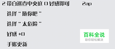 第四步:1、好感度到30;2、带白巡查中央庭,触发剧情选择“会不会有危险”,我相信白