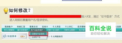首先插入K宝,再打开农行官网→ 个人网上银行登陆→ 证书登陆→输入K宝密码→ 客户服务→ 用户名登陆维护→ 设置用户名/密码。如图。