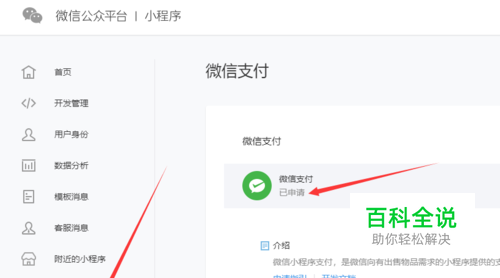 首先登陆你的微信公众号或者微信小程序的后台。确认“微信支付”部分的状态是“已申请”。否则按照后台的提示进行申请工作,这个过程一般需要若干个工作日才能完成。