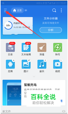 若你平时是通过文件管理器来删除文件的,那你可以借助这个自带的回收站的se文件管理器来找回文件。点击左上角的菜单键。