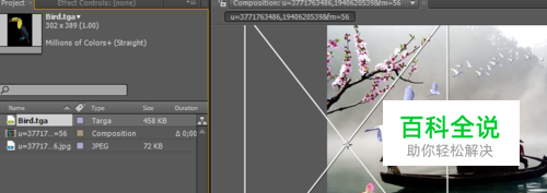 打开AE,导入你的素材,这里以两张图片为例,一张作为背景,将另一张拖到素材演示窗格,并调整合适位置