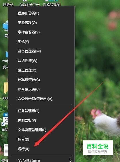 在Windows10系统桌面,右键点击开始菜单按钮,在弹出菜单中选择“运行”菜单项