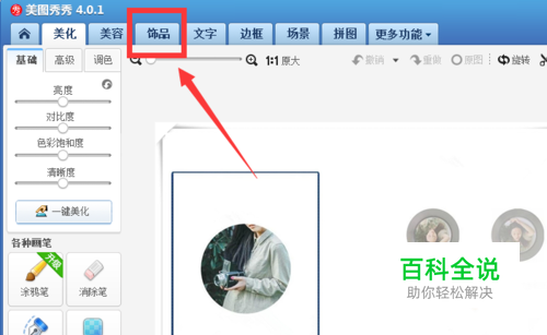 首先我们打开美图秀秀(没有的去下载并安装好),找到我们要修改的图片,把它拖到软件里面;或者找到要修改的图片,右击选择"美图秀秀"打开,打开后看到如下图所示,点击左上角的”饰品“。