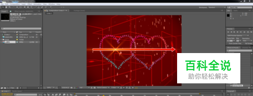 接下来,调整复制出的文字层的位置,使其产生错帧不同步的效果。用钢笔工具画出箭的形状图层,然后对其填充颜色,并在两个心快出来的地方做位置关键帧动画,使箭从左到右划过。
