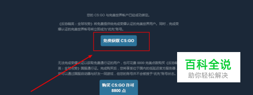 完美通行证和csgo帐号完成绑定后,首次登录即可自动弹出下图所示的界面,点击“免费获取csgo”。