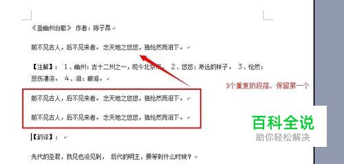 假设小编举例的这个文档中有3处重复的段落,我们现在只需要第一次出现的内容,后面重复的段落可以全部删除。这样在实际工作中也是比较符合常理的。