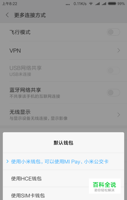在默认钱包中,默认为使用小米钱包,可以使用MI pay,小米公交卡 当然,你也可以选择其他的:使用HCE钱包、使用SIM卡钱包