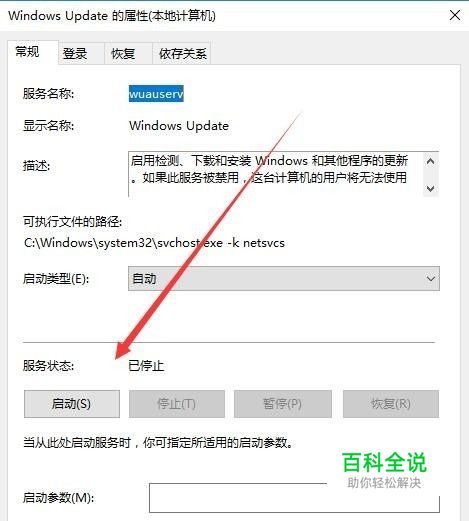 接着在Windows Update属性窗口中,点击“启动”按钮 ,启动Windows UPdate服务