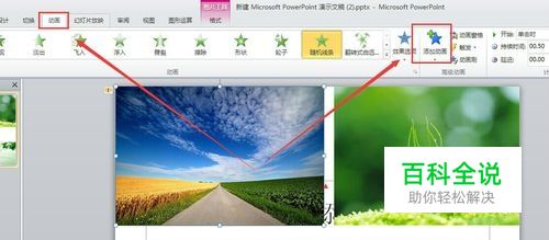 我们用鼠标选定某副图片作为焦点事件,在“动画”功能区,找到“添加动画”,其实添加动画就是在自定义动画了。根据小编提示操作,就可以找到需要找的功能按钮。如下图所示。