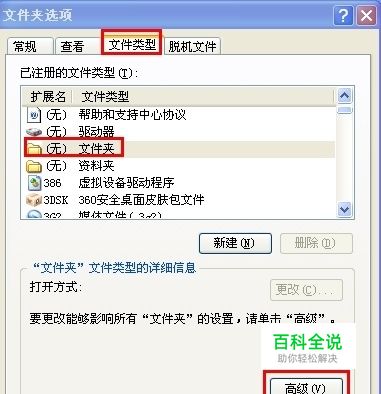 切换到“文件类型”选项卡,然后在“已注册的文件类型”里找到“文件夹”,再点高级。