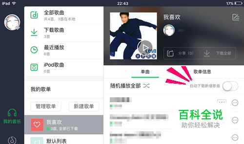 这样就可以利用歌单进行歌曲快速同步,如果需要实时同步还可以点击开关开启[自动下载新增歌曲],以后同步歌曲更省心了