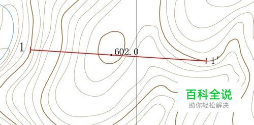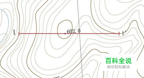 以下图中红线为剖面线绘制地形图剖面,首先确认剖面线起点高程,下图剖面线1-1′起点高程为550,等高距为5米,