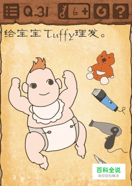 第31关:给宝宝Tuffy理发。 提示:还记得之前把宝宝哄睡的一关吗,先让宝宝睡着,再给宝宝理发,宝宝就不会哭了。 答案是:双手拿着手机,左右慢慢摇晃身体,会带动手机摇晃,这样类似摇篮的动作,可以使宝宝哄睡,宝宝睡着后,移动右边第二个电动理发器到宝宝头顶,在头发处移动,待到头发慢慢减少,直至没有,即可过关了。