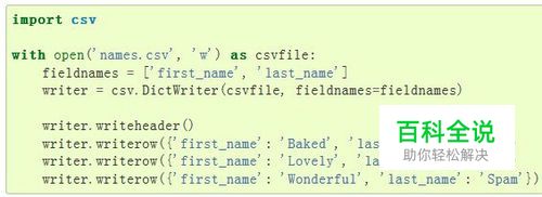 官方例子:我们看到,有专门的函数来写入表头,没有表头数据是无法对应的。需要注意的是,对于下列语句,‘w’需要修改为‘wb’,否则每次写入会有多余空行 with open('names.csv', ' wb') as csvfile