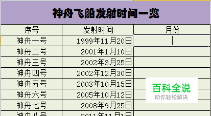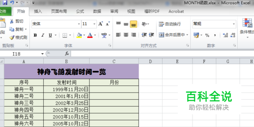 MONTH函数的使用方法 以如下表格为例进行演示,假设我们需要提取发射时间中的月份。