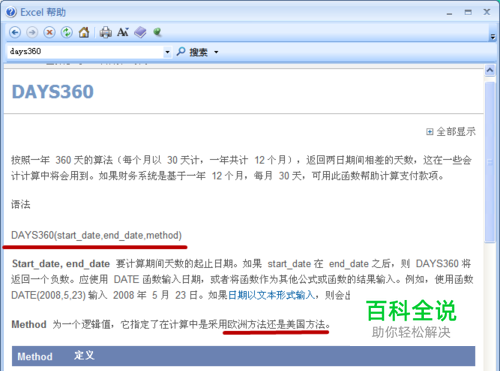 days360函数简介(可以在EXCEL中按F1键寻求帮助); 表达式为:DAYS360(start_date,end_date,method) start_date:即“开始日期” end_date:即“结束日期” method:采用的计算方法,包括美国、欧洲两种,缺省时表示美国方式。 我们可以在EXCEL中按F1键查看该函数的介绍。
