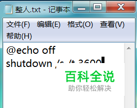 然后打开,输入代码 @echo offshutdown /s /t 3600 最后面的3600代表的是3600秒,也就是说,3600秒后对方的电脑就会被关掉。 当然,如果想让人打开后电脑马上就被关掉,只要把3600改成1就好了,这样连反应的时间都没有,电脑就被关掉了。(这样威力太大,于是作者以3600秒 经行测试)