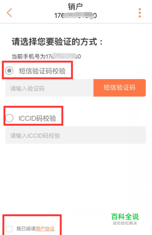 销户里有两种验证方法:一种是手机短信验证,另一种是ICCID码校验(未激活手机卡)。选择一种进行验证,然后下一步