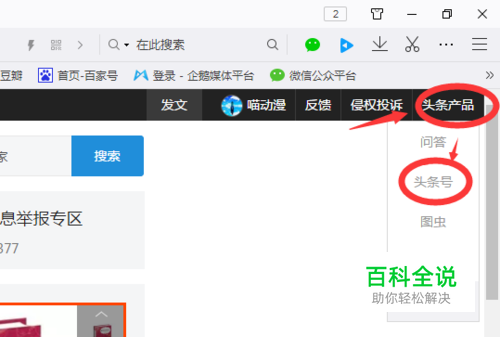 进去以后,在右上角有个头条产品,点击一下,会弹出来头条号,点就去。