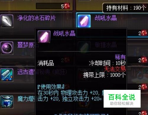 首先来看可以在游戏中不花钱的药剂:战吼水晶,三十秒内增加物理、魔法、独立20点,苍蝇腿级别的提升。起源版本之后可以用红玉髓换取。