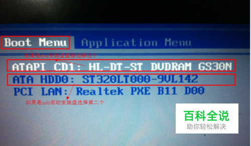 无论您是笔记本还是电脑,不管您手里是dvd还是usb系统盘,开机按F12不动,直接进入开机启动设置界面,出现选项“Boot Menu”界面,老点的主板界面会出现 “select a boot first device”比如您现在手里是光盘的,光标键直接选择CDROM,是usb则选择USB-HDD按Enter键就ok了。