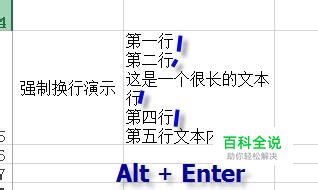 强制换行,不同于自动换行。强制换行插入换行符的位置进行换行,而自动换行根据单元格的宽带进行换行。在需要强制换行的地方,按下Alt + Enter组合键即可。