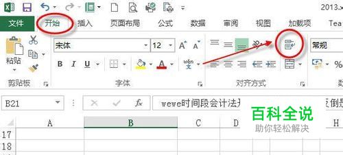 自动换行更加单元格的宽带进行换行,当文本超过单元格的最大宽带及自动换行显示,高度自适应。在Excel2013中设置自动换行有多种方法。方法一:如下图所示在B21单元格中输入一段超过其宽度的文本,点击“开始”选项卡中图示图标即可。