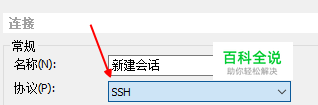 进入新建连接界面,在名称处填写连接名称,协议选择SSH