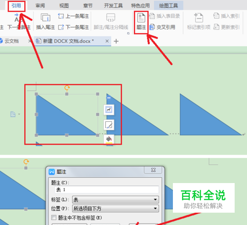 选中任意一张图片,点击上方工具栏中的引用-题注,弹出题注对话框。