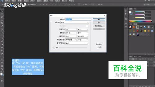 按"Ctrl+N"键,弹出对话框,将宽度设为50厘米,将高度设为28厘米,其他保持默认,点击确定
