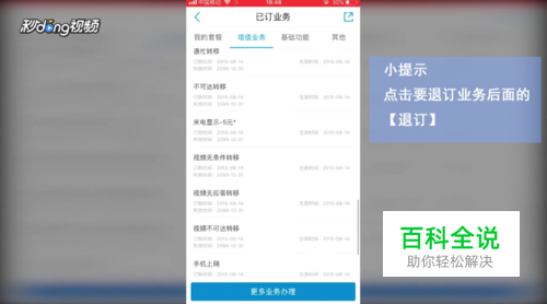 然后点击“增值业务”,再点击想要退订业务后面的“退订”,即可成功退订业务。退订成功后,会收到中国移动发来的短信。