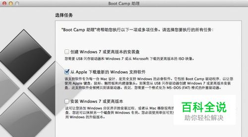 插入Windows 安装U盘或者光盘,再次启动Boot Camp助理,选择安装Windows 7 或更高版本