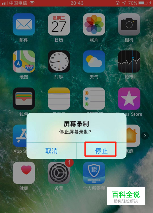 点击红色区域后,屏幕上会出现是否停止录制的对话框提示,点击【停止】,录屏结束。屏幕录制的内容会自动保存在手机相册中!