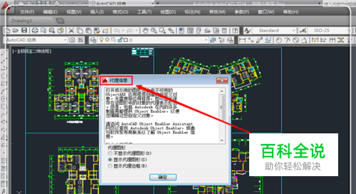 进入选项对话框,然后点击“打开和保存”,在其目录下,将“显示代理信息对话框”前面的勾去掉,然后点击“应用”,最后点击“确定”,返回绘图窗口,下次打开就不会显示代理信息了。