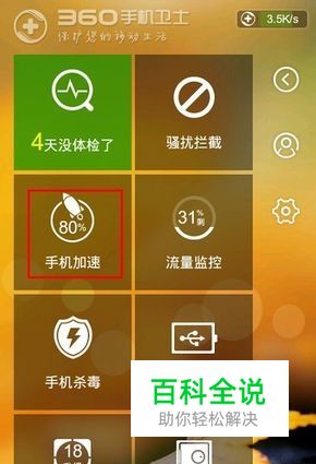 在手机端安装360手机卫士或其他辅助软件,在界面中点击“手机加速”项,如图所示。然后软件会自动扫描垃圾缓存等文件,点击“一键加速”将文件从SD卡中清理。