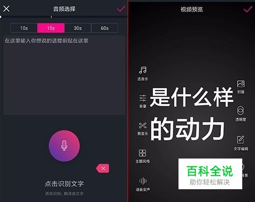视频剪辑页面,拖动下方视频条两侧的位置,可以快速剪辑,由于文字视频和原视频要匹配,一个剪了,另一个也要剪掉相同部分。 编辑完成,点击右上角对勾,进入视频编辑页面,默认是上下拼接的。