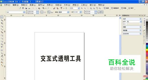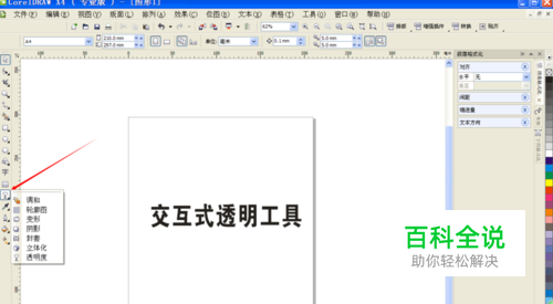 选择”透明度“选项,这时文档上方的属性栏会出现“交互式底纹透明度”工具栏。 PS:此时如果没有先选中文字,此时的属性栏是灰度的;必须先要点选文字,再执行上述操作。
