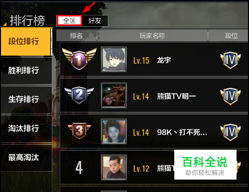 选择全区,排行榜就出现了,排行榜有很多可选“段位排行”,“胜利排行”,“生存排行”,“淘汰排行”,“最高淘汰”共五大类,,如图所示