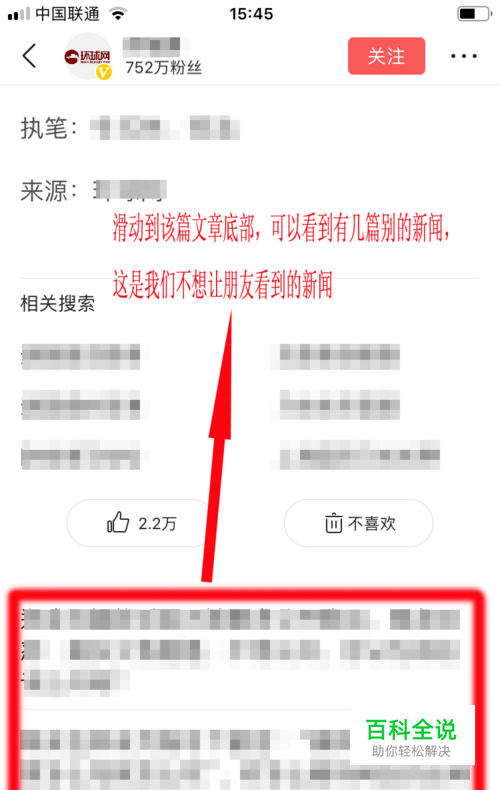 滑动到文章底部可以看到有几篇其他新闻,这是我们不想给朋友看到的。