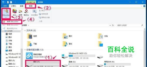 Windows10系统给磁盘加密的简单方法 步骤: 进入资源管理器,(1)点击需要加密的磁盘(如本机的娱乐F:\磁盘),(2)点击管理,(3)点击BitLocker项的小三角,(4)在下拉菜单中点击【启用BitLocker】;