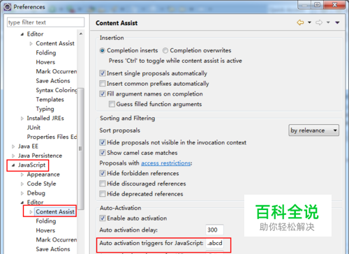 .继续打开JavaScript→Editor→Content Assist 修改Auto Activation triggers for javaScript的值为:.abc 点击apply按钮。