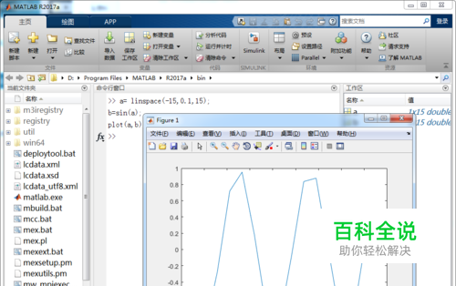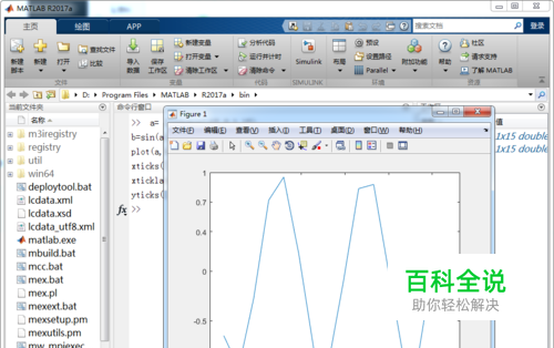 第一步:首先我们使用plot()绘制一个图形,如我们在MATLAB命令窗口中输入代码: a= linspace(-15,0.1,15); b=sin(a); plot(a,b) 然后运行程序,将绘制一个横坐标-15到15的正弦函数曲线图,如下图所示。