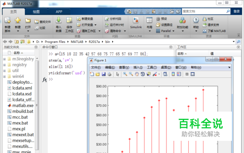 第四步:下面我们来进行坐标轴刻度标签格式的修改,使用特殊符号显示刻度标签,得使用ytickformat()函数,如我们在MATLAB命令窗口中输入代码: a=[15 18 22 35 42 57 68 75 77 65 57 69 77 86]; stem(a,'r*') xlim([1 16]) ytickformat('usd') 运行程序代码,即可成功修改坐标轴刻度标签为特殊格式字符,如下图所示,我们如需更改成其他特殊格式字符,在ytickformat()函数中更改字符串即可。