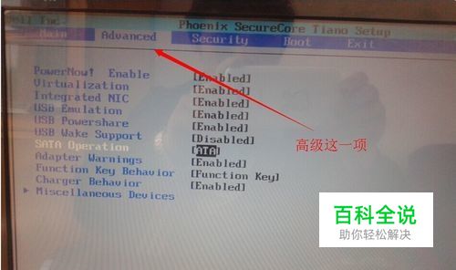 进入cmos设置页面,找到高级这一项,不同电脑项目不一样,总之你找到SATA Operation这一项