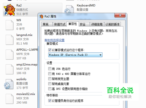 调节兼容,右键点击红警文件中的ra2.exe属性面板,点兼容性栏勾选兼容模式设置为window xp(Service Pack 3),并勾选以管理员身份运行,确定。
