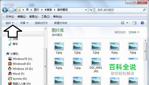 使用Windows+E快捷键,调出资源管理器→库→图片→组织。
