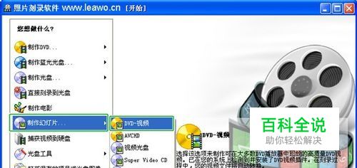 随后弹出的窗口如下,选择“制作幻灯片”-“DVD-视频”,此项可用来制作在大多数DVD播放器中回放的高质量DVD视频。