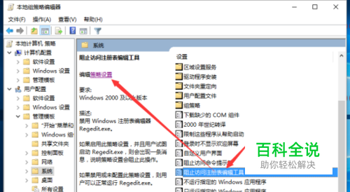 5、在“系统”选项右侧窗口,找到“阻止访问注册表编辑工具”选项选中并双击鼠标左键将其打开。如图所示;