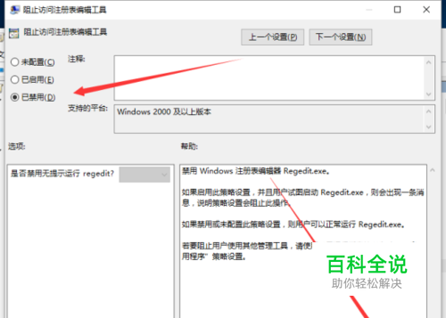 6、在打开的“阻止访问注册表编辑工具”对话窗口中,将其设置更改为“已禁用”选项,然后在点击“应用-->确定”按钮退出即可。如图所示;